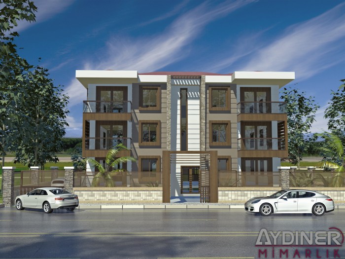 Proje tek blok apartman projesidir. Mimari projesi Dalaman’daki yerel bir mimari ofis tarafından çizilmiş olup, dış cephe görselleştirmeleri, peyzaj düzenlemesi, bina girişi ve cephe malzemeleri Aydıner Mimarlık tarafından tasarlanmıştır. Projemizde Dalaman bölgesine farklı bir bakış açısı getirmek amacıyla doğal taş ve ahşap cephe malzemeleri kullanılmıştır. Apartman 3 katlı olup 2 daire üzerine oturtulmuş ve 6 bağımısız bölümden oluşmaktadır.